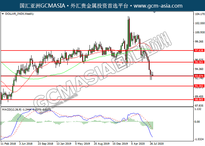 DOLLAR_INDX,Weekly:美指空头排列,目前测试前期支撑。MACD空头动能有所略增,若下破可关注空头为主。上方关95.55压力和97.65压力,下方关注93.05支撑和91.30支撑。