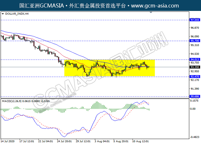 DOLLAR_INDX,H4:美指仍区间震荡盘整。然而,MACD显示空头信号,动能略减,短期关注空头方向为主。上方关94.00压力和95.70压力,下方关注92.45支撑和90.70支撑。