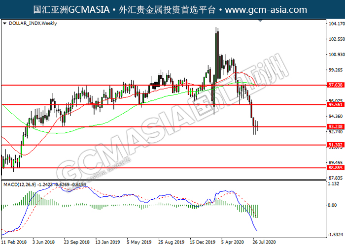 DOLLAR_INDX,Weekly: 美指空头排列,目前测试前期支撑。MACD空头动能有所略增,若下破可关注空头为主。上方关95.55压力和97.65压力,下方关注93.25支撑和91.30支撑。