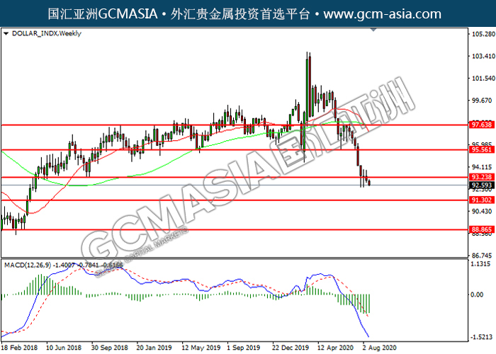 DOLLAR_INDX,Weekly:美指突破前期支撑,震荡下行。然而,MACD空头动能略减,短期关注技术性回调为主。上方关93.25压力和95.55压力,下方关注91.30支撑和88.85支撑。