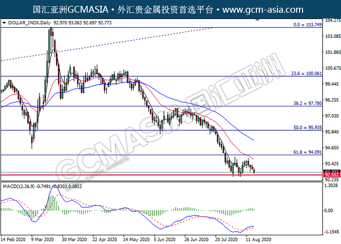 DOLLAR_INDX,Daily:美指高位承压后回落。MACD多头动能有所略减,短期持续关注空头趋势为主。上方关94.10压力和95.95压力,下方关注92.55支撑和91.45支撑。