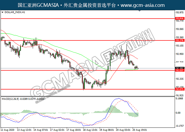 DOLLAR_INDX,H1:美指震荡下行,目前测试前期支撑。MACD空头动能略减,短期可关注技术性回调。上方关93.25压力和93.80压力,下方关注92.55支撑和92.05支撑。
