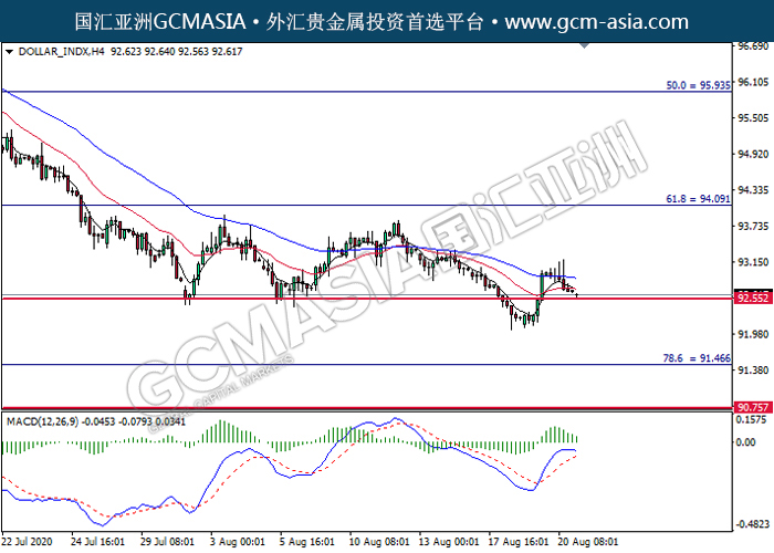 DOLLAR_INDX,H4:美指高位承压后回落,目前测试着支撑位。MACD多头动能略减,若突破可持续关注空头趋势为主。上方关94.10压力和95.95压力,下方关注92.55支撑和91.45支撑。