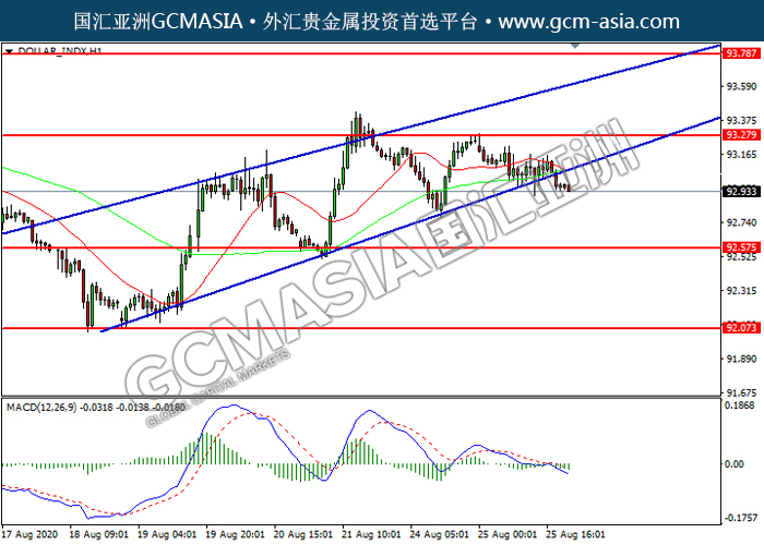 20200826 DOLLAR_INDX by willy | Aug 26, 2020 | 美元指数 | 0 comments GCMAsia- DOLLAR_INDX DOLLAR_INDX 2020-08-26 DOLLAR_INDX,H1:美指震荡下行。MACD空头动能略增,短期可关注空头为主。上方关93.30压力和93.80压力,下方关注92.55支撑和92.05支撑。