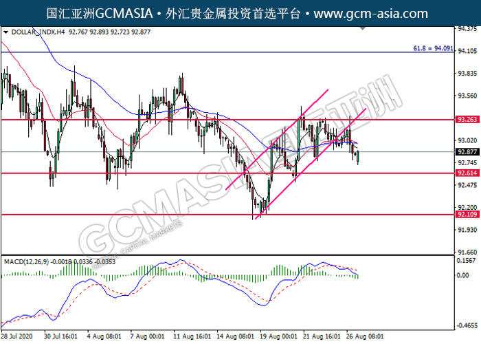 DOLLAR_INDX,H4:美指突破后持续下行。MACD空头动能略增,短期可持续关注空头趋势为主。上方关93.25压力和94.10压力,下方关注92.60支撑和92.10支撑。