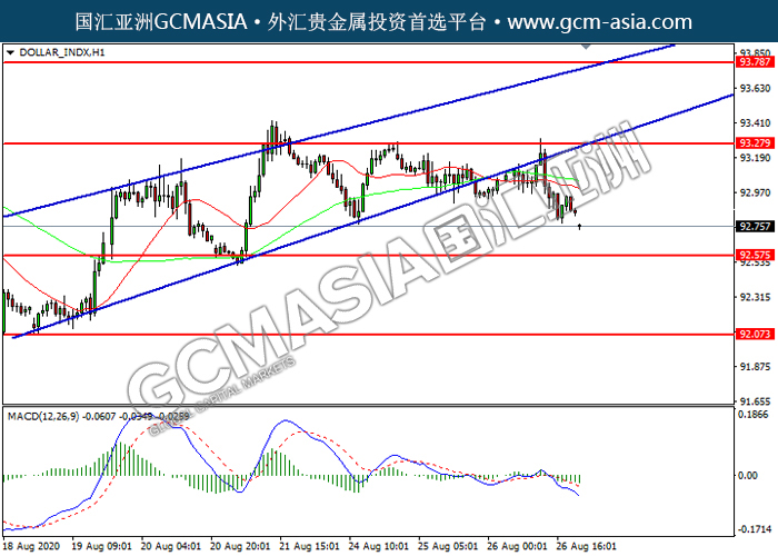 20200827 DOLLAR_INDX by willy | Aug 27, 2020 | 美元指数 | 0 comments GCMAsia- DOLLAR_INDX DOLLAR_INDX 2020-08-27 DOLLAR_INDX,H1:美指震荡下行。MACD空头动能略增,短期可关注空头为主。上方关93.25压力和93.80压力,下方关注92.55支撑和92.05支撑。