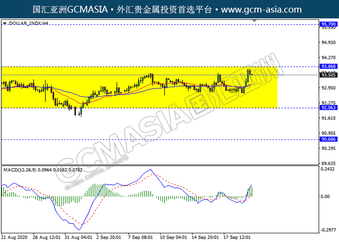 DOLLAR_INDX,H4:美指仍在区间交易,目前测试靠近前期压力。然而,MACD显示多头,动能略增,若突破关注多头趋势为主。上方关93.85压力和95.70压力,下方关注92.05支撑和90.70支撑。