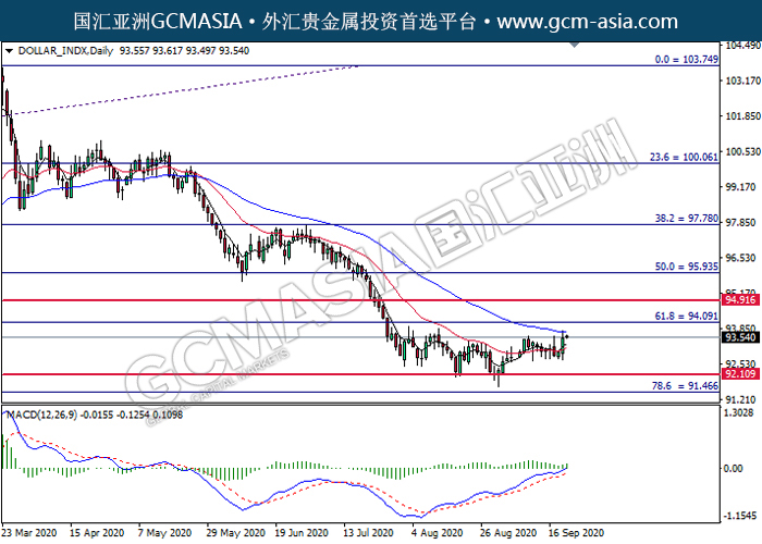 20200922 DOLLAR_INDX-午间 by willy | Sep 22, 2020 | 美元指数 | 0 comments GCMAsia-DOLLAR_INDX DOLLAR_INDX 2020-09-22 DOLLAR_INDX,Daily:美指低位反弹。MACD多头动能转强,短期可关注多头为主。上方关94.10压力和94.90压力,下方关注92.10支撑和91.45支撑。