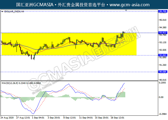 DOLLAR_INDX,H4:美指仍在区间交易,目前测试前期压力。然而,MACD多头动能有所略减,短期关注技术性空头回调趋势为主。上方关93.90压力和95.70压力,下方关注92.05支撑和90.70支撑。