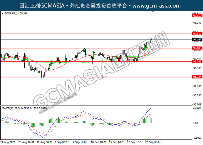DOLLAR_INDX,H4:美指突破前期压力,震荡上行。MACD多头动能略增,短期可关注多头为主。上方关94.50压力和95.65压力,下方关注93.65支撑和92.75支撑。