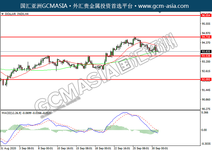 DOLLAR_INDX,H4:美指震荡下行,目前靠就前期支撑。MACD空头动能略增,若下破可关注空头为主。上方关94.70压力和96.05压力,下方关注93.55支撑和92.10支撑。