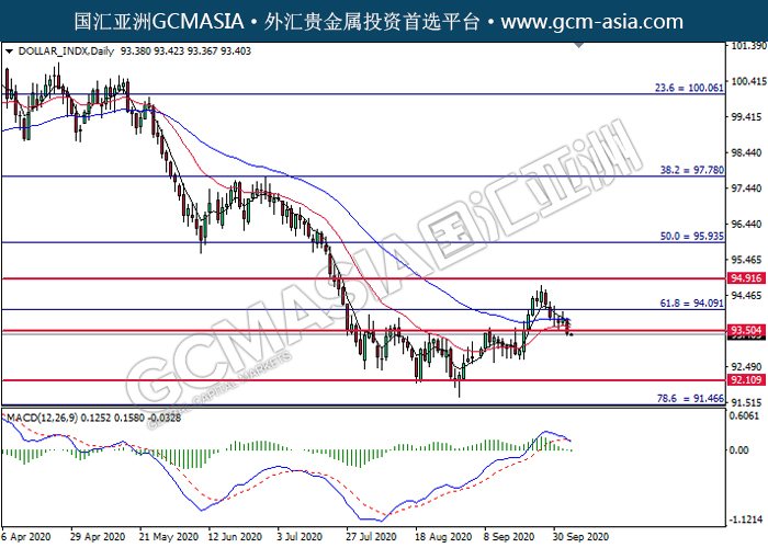 DOLLAR_INDX,Daily:美元指数突破后持续下行。MACD显示空头信号,动能略减,中期关注空头趋势为主。上方关93.50压力和94.10压力,下方关注92.10支撑和91.45支撑。