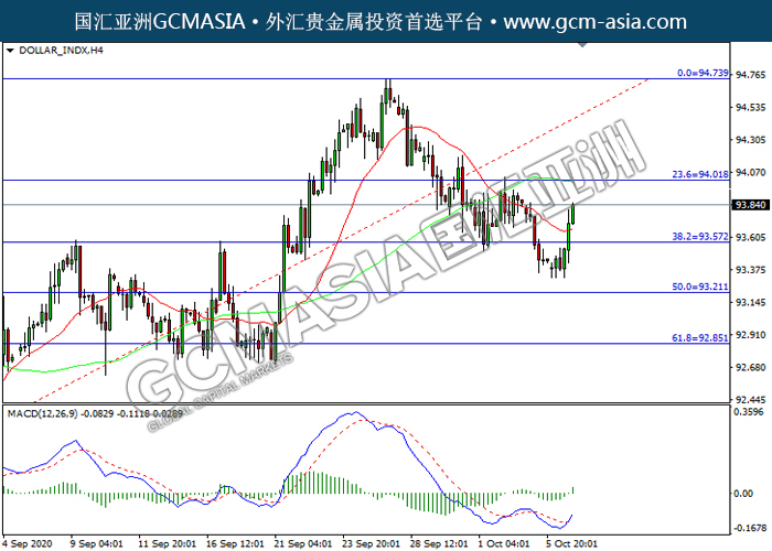 DOLLAR_INDX,H4:美指突破前期压力,震荡上行。MACD已形成金叉,动能转强,短期可关注多头为主。上方关94.00压力和94.75压力,下方关注93.55支撑和93.20支撑。