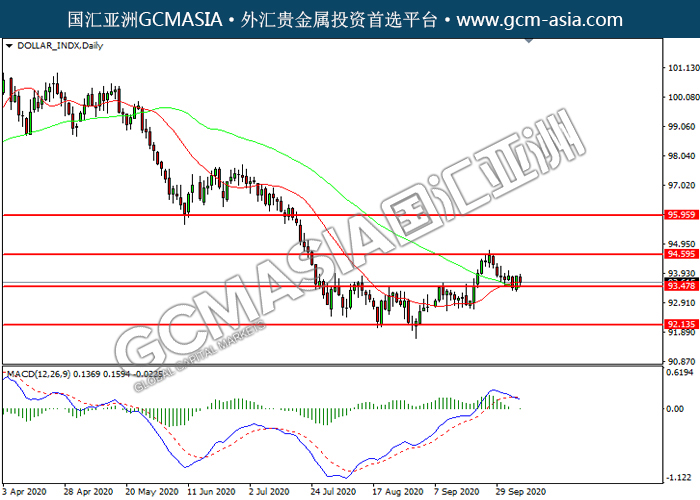 DOLLAR_INDX,Daily:美指震荡下行,目前测试前期支撑。MACD已形成死叉,动能转弱,若下破可关注空头为主。上方关94.60压力和95.95压力,下方关注93.45支撑和92.15支撑。