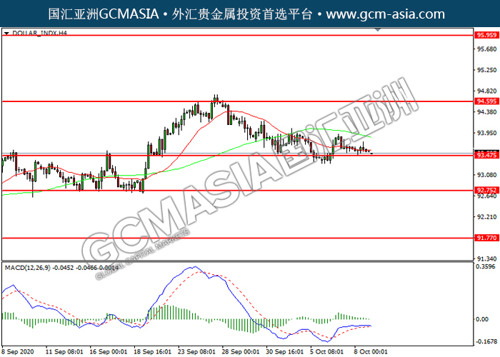 DOLLAR_INDX,H4:美指震荡下行,目前测试前期支撑。MACD多头动能略减,若下破可关注空头为主。上方关94.60压力和95.95压力,下方关注93.45支撑和92.15支撑。