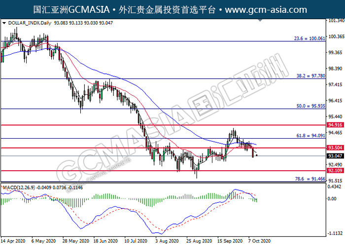 20201012 DOLLAR_INDX-午间 by willy | Oct 12, 2020 | 美元指数 | 0 comments DOLLAR_INDX,Daily:美元突破后持续下行。MACD显示空头信号,动能略减,中期可关注空头趋势为主。上方关93.50压力和94.10压力,下方关注92.10支撑和91.45支撑。