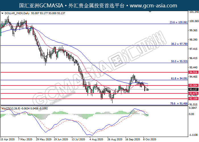 DOLLAR_INDX,Daily:美元突破后持续下行。然而,MACD显示多头信号,动能略增,中期可关注技术性上调为主。上方关93.50压力和94.10压力,下方关注92.10支撑和91.45支撑。