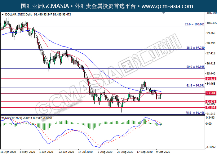 DOLLAR_INDX,Daily:美元低位反弹,目前测试着压力位。MACD显示多头信号,动能略增,若突破可关注多头趋势为主。上方关93.50压力和94.10压力,下方关注92.70支撑和92.10支撑。