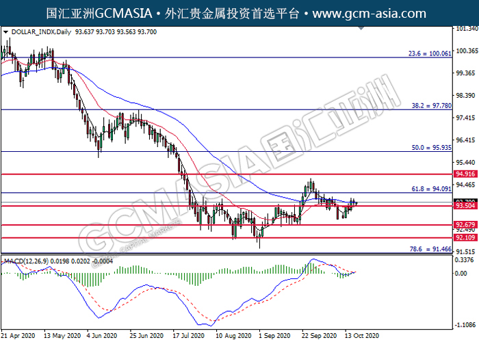 DOLLAR_INDX,Daily:美元突破后持续上行。MACD空头动能略减,短期可关注多头走势为主。上方关94.10压力和94.90压力,下方关注93.50支撑和92.70支撑。