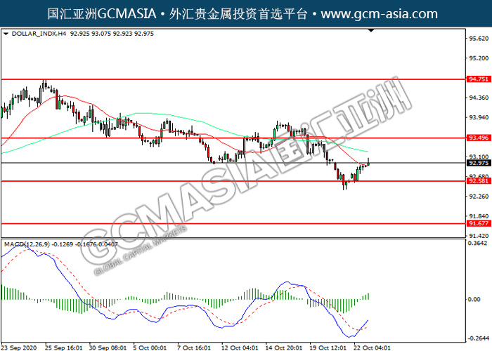 20201023 DOLLAR_INDX-午间 by keyk | Oct 23, 2020 | 美元指数 | 0 comments GCMAsia - DOLLAR_INDX DOLLAR_INDX 2020-10-23 DOLLAR_INDX,H4:美指震荡上行。MACD多头动能略曾,短期可关注多头走势为主。上方关93.50压力和94.75压力,下方关注92.60支撑和91.65支撑。