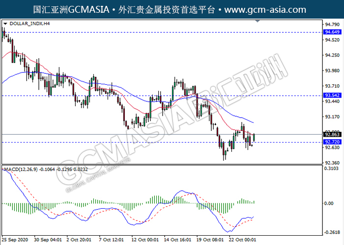20201026 DOLLAR_INDX-午间 by keyk | Oct 26, 2020 | 美元指数 | 0 comments GCMAsia - DOLLAR_INDX DOLLAR_INDX 2020-10-26 DOLLAR_INDX,H4:美指触底反弹上行。MACD动能略增,短期继续看多反弹为主。上方关93.55压力和94.65压力,下方关注92.70支撑和91.75支撑。