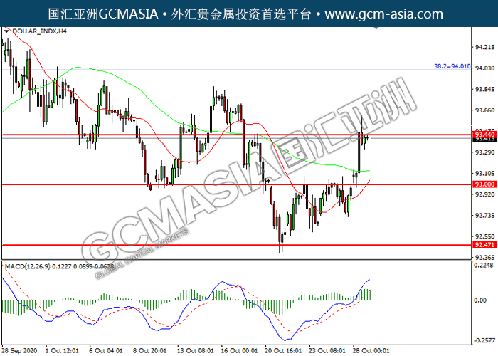 DOLLAR_INDX,H4:美元震荡上行,目前测试前期压力。然而,MACD多头动能略减,短期可关注技术性回调。上方关93.45压力和94.00压力,下方关注93.00支撑和92.45支撑。
