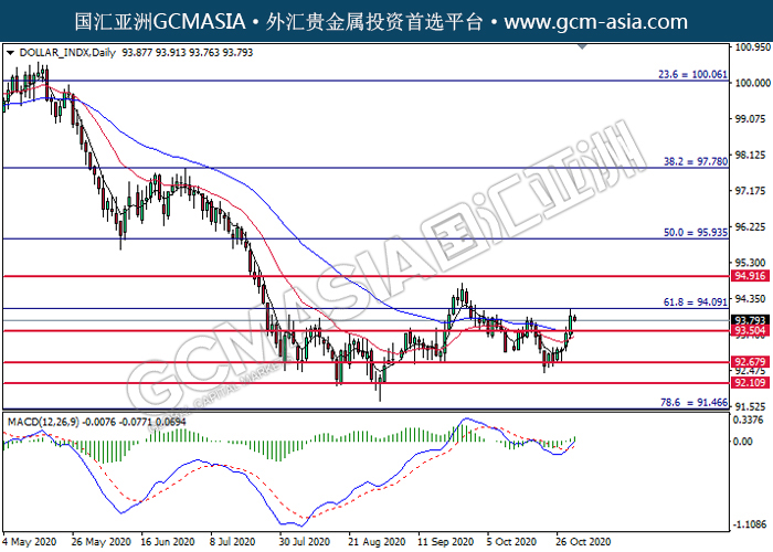 DOLLAR_INDX,Daily:美元突破后持续上行。MACD多头动能略增,短期可关注多头走势为主。上方关94.10压力和94.90压力,下方关注93.50支撑和92.70支撑。