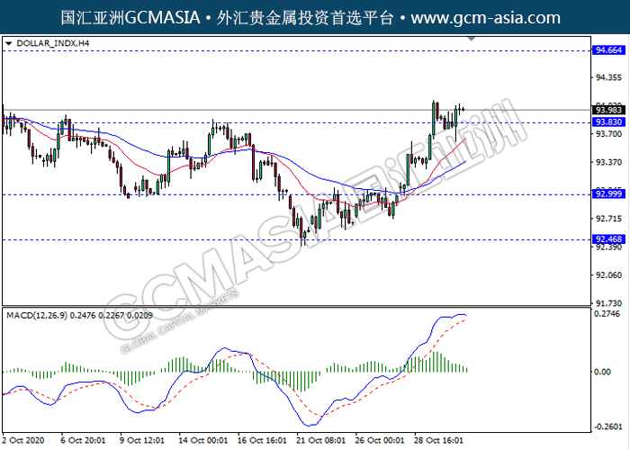 DOLLAR_INDX,H4:美指震荡盘整靠近前期支撑。然而,MACD显示空头,多头动能略减,若突破关注空头趋势为主。上方关94.65压力和95.75压力,下方关注93.85支撑和93.00支撑。