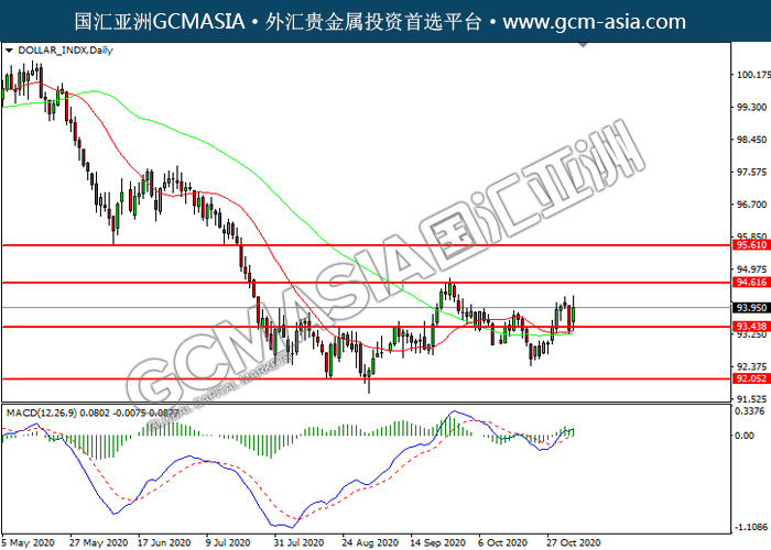 DOLLAR_INDX,Daily:美指低位反弹。然而,MACD多头动能略减,短期可关注技术性回调为主。上方关94.60压力和95.60压力,下方关注93.45支撑和92.05支撑。