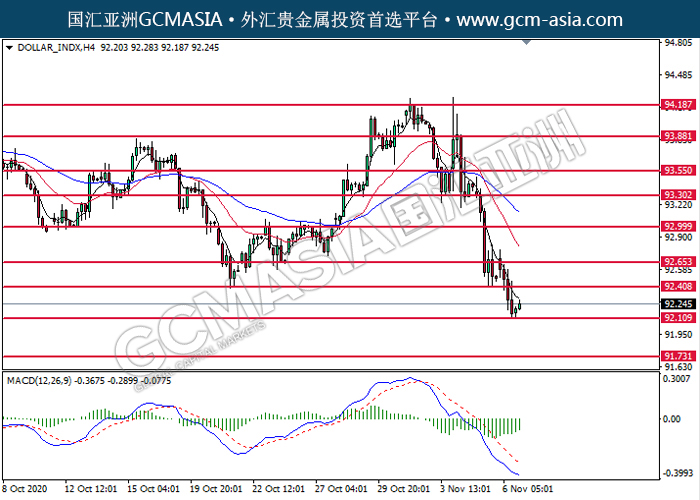 20201109 DOLLAR_INDX by willy | Nov 9, 2020 | 美元指数 | 0 comments GCMAsia-DOLLAR_INDX DOLLAR_INDX 2020-11-09 DOLLAR_INDX,H4:美指近期低位反弹。MACD动能略增,短期可关注多头反弹为主。上方关92.40压力和92.65压力,下方关注92.10支撑和91.75支撑。