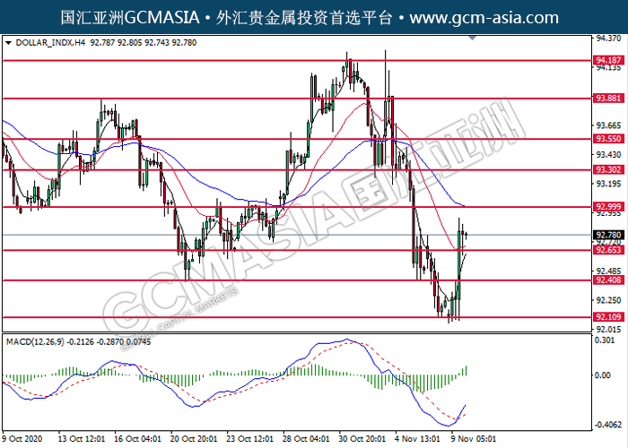 20201110 DOLLAR_INDX by willy | Nov 10, 2020 | 美元指数 | 0 comments GCMAsia-DOLLAR_INDX DOLLAR_INDX 2020-11-11 DOLLAR_INDX,H4:美指突破后持续上行。MACD动能略增,短期可关注多头走势为主。上方关93.00压力和93.30压力,下方关注92.65支撑和92.40支撑。