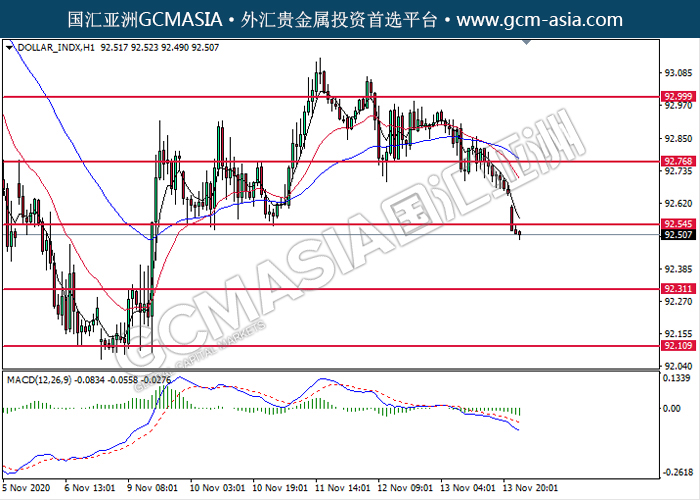 20201116 DOLLAR_INDX-午间 by willy | Nov 16, 2020 | 美元指数 | 0 comments GCMAsia-DOLLAR_INDX DOLLAR_INDX 2020-11-16 DOLLAR_INDX,H1:美指突破后持续下行。MACD动能略减,短期可关注空头走势为主。上方关92.55压力和92.75压力,下方关注92.30支撑和92.10支撑。