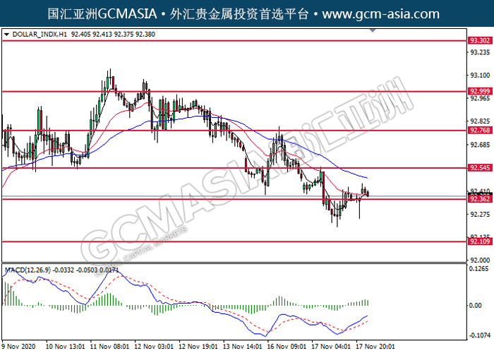 DOLLAR_INDX,H1:美指高位承压后回落。MACD动能略减,短期可关注空头回调为主。上方关92.55压力和92.75压力,下方关注92.35支撑和92.10支撑。