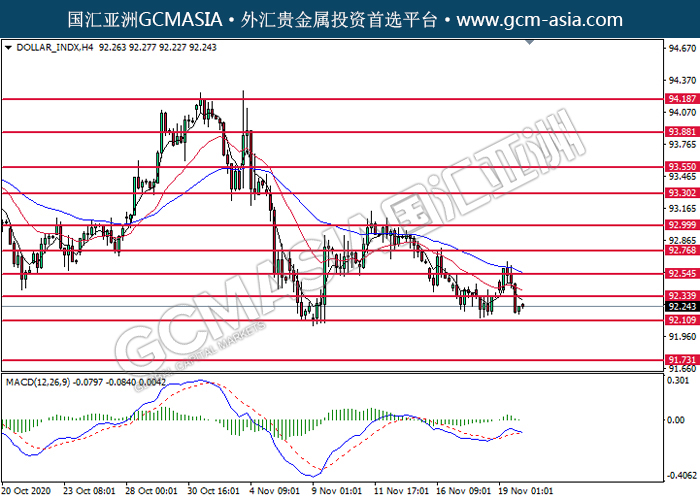 20201120 DOLLAR_INDX-午间 by keyk | Nov 20, 2020 | 美元指数 | 0 comments GCMAsia - DOLLAR_INDX DOLLAR_INDX 2020-11-20 DOLLAR_INDX,H4:美指突破后持续下行。MACD动能略减,短期可关注空头走势为主。上方关92.35压力和92.55压力,下方关注92.10支撑和91.75支撑。
