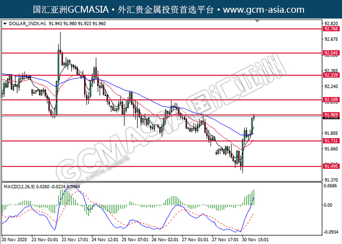 DOLLAR_INDX,H1:美指多头排列,目前测试压力位。MACD多头动能略增,若上破可关注多头为主。上方关91.95压力和92.10压力,下方关注91.75支撑和91.50支撑。
