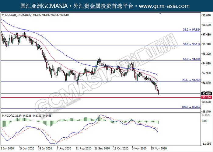 20201204 DOLLAR_INDX by willy | Dec 4, 2020 | 美元指数 | 0 comments GCMAsia-DOLLAR_INDX DOLLAR_INDX 2020-12-04 DOLLAR_INDX,Daily:美指突破后持续下行。MACD空头信号,短期可关注空头为主。上方关91.95压力和94.40压力,下方关注90.15支撑和88.85支撑。