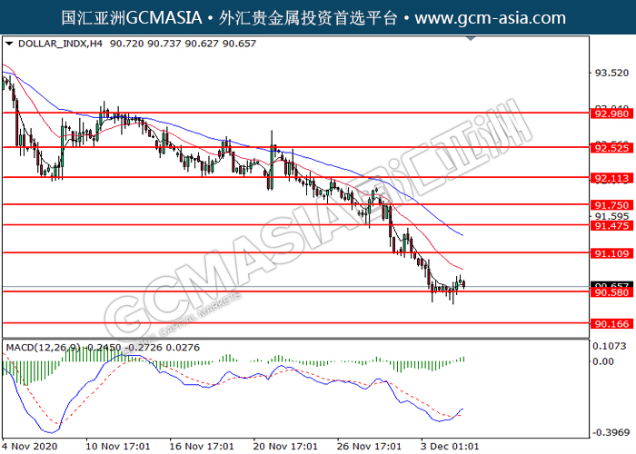 20201207 DOLLAR_INDX-午间 by willy | Dec 7, 2020 | 美元指数 | 0 comments GCMAsia-DOLLAR_INDX DOLLAR_INDX 2020-12-07 DOLLAR_INDX,H4:美指低位反弹。MACD动能略增,短期可关注多头为主。上方关91.10压力和91.45压力,下方关注90.60支撑和90.15支撑。