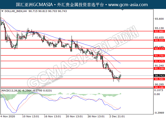 20201207 DOLLAR_INDX by willy | Dec 7, 2020 | 美元指数 | 0 comments GCMAsia-DOLLAR_INDX DOLLAR_INDX 2020-12-07 DOLLAR_INDX,H4:美指低位反弹。MACD动能略增,短期可关注多头为主。上方关91.10压力和91.45压力,下方关注90.60支撑和90.15支撑。