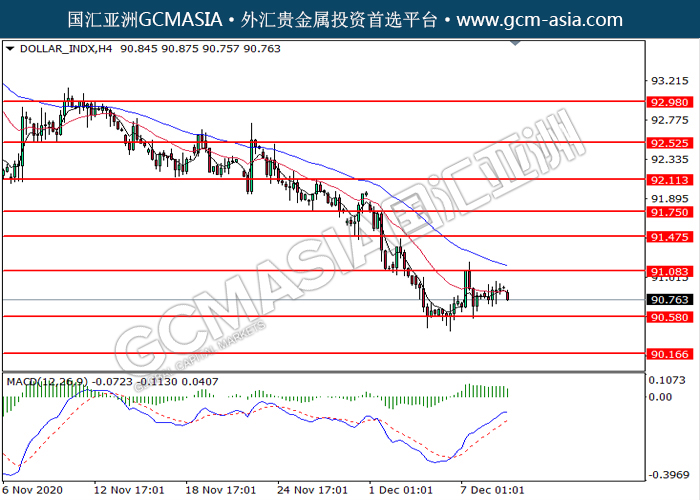 20201209 DOLLAR_INDX-午间 by keyk | Dec 9, 2020 | 美元指数 | 0 comments GCMAsia-DOLLAR_INDX DOLLAR_INDX 2020-12-09 DOLLAR_INDX,H4:美指高位承压后回落。MACD动能略减,短期可关注空头为主。上方关91.10压力和91.45压力,下方关注90.60支撑和90.15支撑。