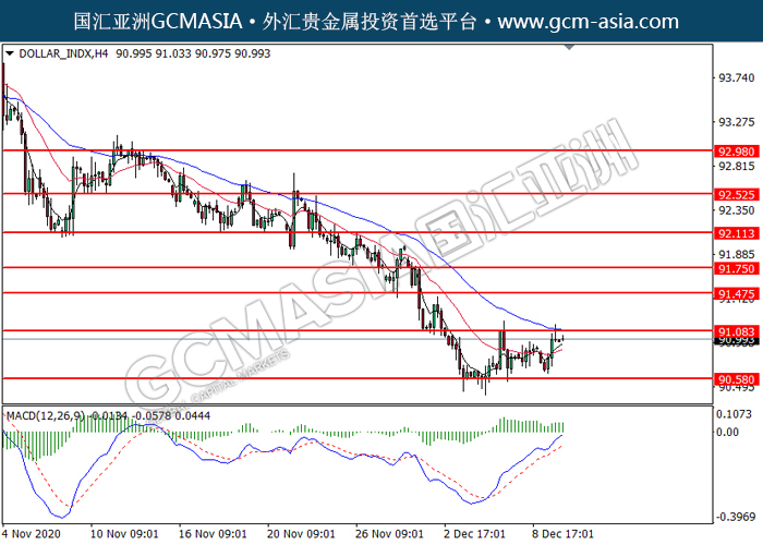 DOLLAR_INDX,H4:美指低位反弹,目前测试着压力位。MACD动能略增,若突破可关注多头为主。上方关91.10压力和91.45压力,下方关注90.60支撑和90.15支撑。