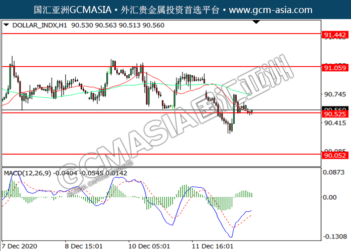 DOLLAR_INDX,H1:美指震荡下行,目前测试前期支撑。MACD多头动能略减,若突破可关注空头为主。上方关91.05压力和91.45压力,下方关注90.50支撑和90.05支撑。