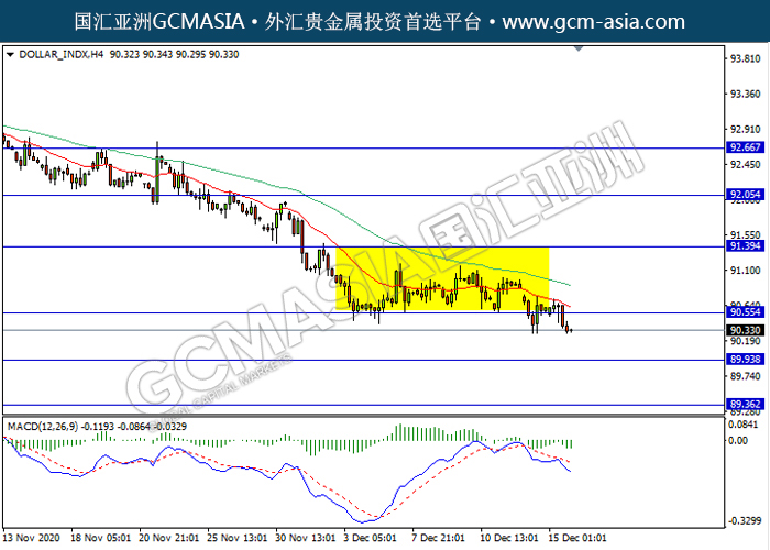 20201216 DOLLAR_INDX by keyk | Dec 16, 2020 | 美元指数 | 0 comments GCMAsia-DOLLAR_INDX DOLLAR_INDX 2020-12-16 DOLLAR_INDX,H4:美元突破前期支撑,震荡下行。MACD动能略减,短期继续看空为主。上方关90.55压力和91.40压力,下方关注89.95支撑和89.35支撑。