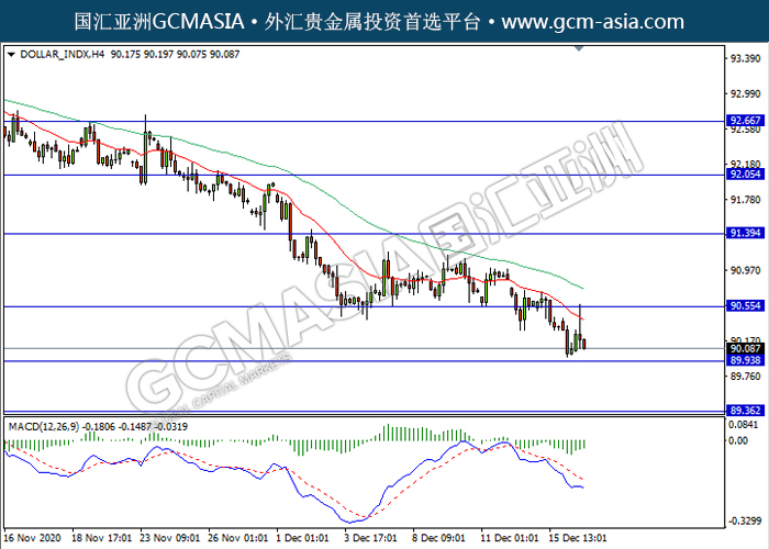 DOLLAR_INDX,H4:美元震荡下行,目前测试靠近前期支撑。MACD仍显示空头信号,动能略减,若突破继续看空为主。上方关90.55压力和91.40压力,下方关注89.95支撑和89.35支撑。