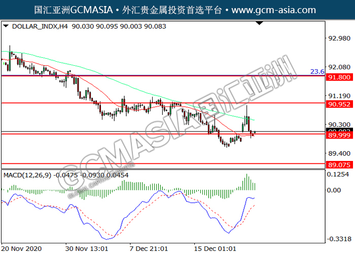 DOLLAR_INDX,H4:美指高位回落,目前测试前期支撑。MACD多头动能略减,若下破可继续看空为主。上方关90.95压力和91.80压力,下方关注90.00支撑和89.05支撑。