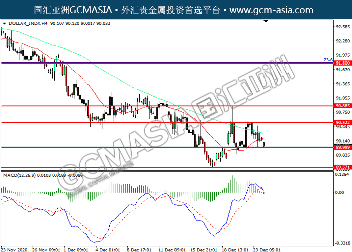DOLLAR_INDX,H4:美指高位回落,目前测试前期支撑。MACD已形成死叉,动能转弱,若下破可关注空头为主。上方关90.50压力和90.90压力,下方关注90.00支撑和89.55支撑。