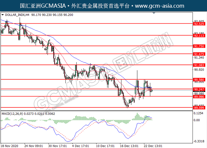 20201224 DOLLAR_INDX by willy | Dec 24, 2020 | 美元指数 | 0 comments GCMAsia-DOLLAR_INDX DOLLAR_INDX 2020-12-24 DOLLAR_INDX,H4:美指突破后持续下行。MACD多头动能略减,短期可关注空头为主。上方关90.25压力和90.60压力,下方关注90.00支撑和89.60支撑。