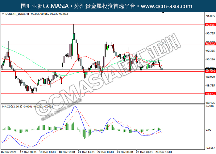DOLLAR_INDX,H4:美指震荡下行,目前测试前期支撑。MACD多头动能略减,若下破可关注空头为主。上方关90.50压力和90.90压力,下方关注90.00支撑和89.55支撑。