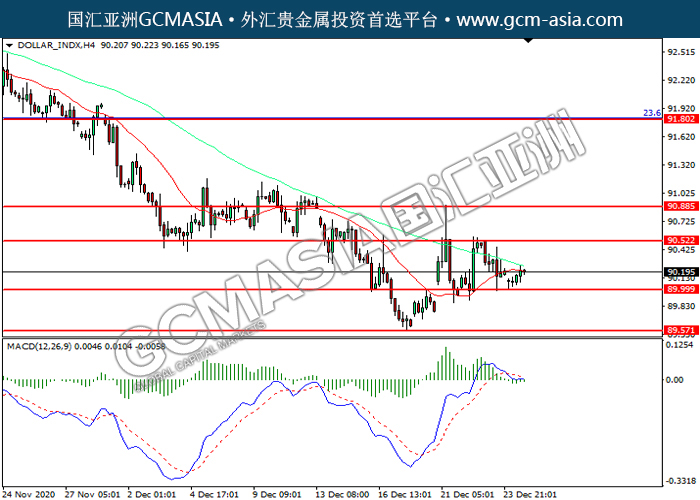20201228 DOLLAR_INDX by willy | Dec 28, 2020 | 美元指数 | 0 comments GCMAsia-DOLLAR_INDX DOLLAR_INDX 2020-12-28 DOLLAR_INDX,H4:美指震荡上行。MACD空头动能略减,短期可关注多头为主。上方关90.50压力和90.90压力,下方关注90.00支撑和89.55支撑。
