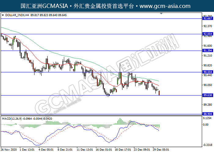 DOLLAR_INDX,H4:美元震荡下行,目前测试靠近支撑。MACD仍显示空头,动能略减,若突破继续看空为主。上方关90.55压力和91.40压力,下方关注89.95支撑和88.90支撑。