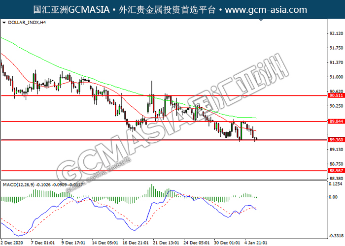 DOLLAR_INDX,H4:美指震荡下行,目前测试前期支撑。MACD已形成死叉,动能转弱,若下破可关注空头为主。上方关89.85压力和90.50压力,下方关注89.35支撑和88.55支撑。